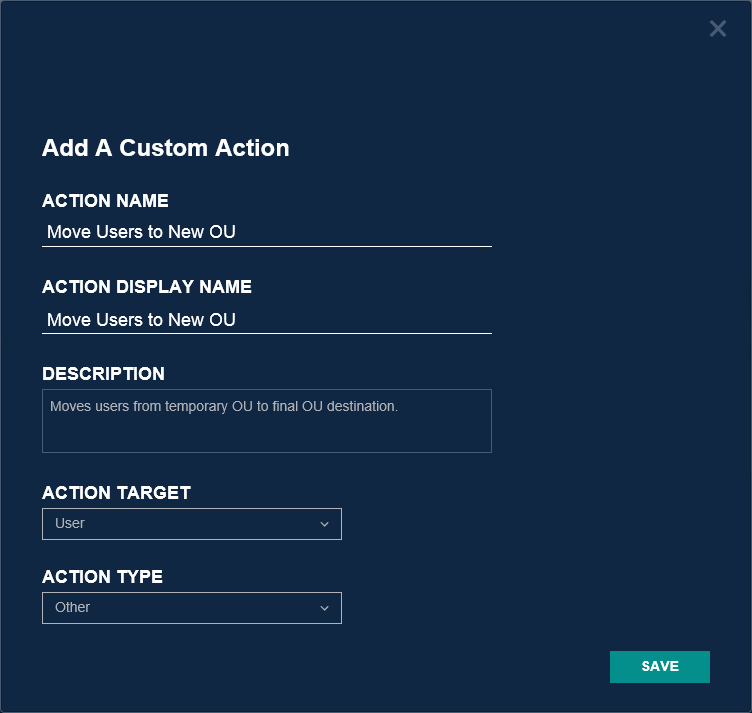 3. On the Actions screen, add a new custom action with Action Target "User" selected. This will create an Actions menu option on the User Actions screen.