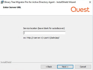 5. On the Enter Server URL screen, enter the FQDN of the server running the Migrator Pro for Active Directory service and click Next.