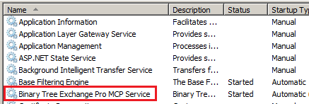 The MCP Windows Service (BinaryTree Migrator Pro for Exchange MCP Service) is the controlling service for all Migrator Pro for Exchange functions. This service should automatically start. Make sure that BinaryTree Migrator Pro for Exchange MCP Service is started in Windows Services.