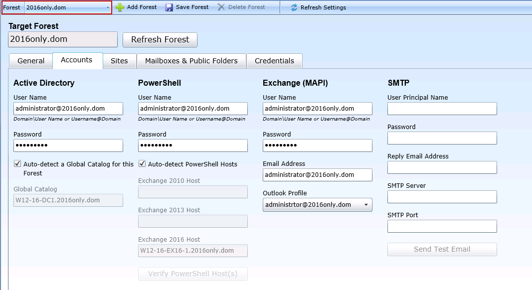 Then, on the Accounts tab, clear the checkbox for Auto-detect the PowerShell Hosts for this Forest, and type the appropriate value into the appropriate PowerShell Host field (Exchange 2010, 2013 or 2016):