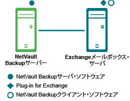 重要: 環境(NetVault BackupサーバーとExchange Serverのマシンを個別に用意するか、両方を1つのマシンで設定するか)に関係なく、Plug‑in for Exchangeは、Exchange Serverメールボックス・データベースが存在するホストにインストールする必要があります。本書の例の画像および手順では、この2台のマシン環境が設定されていて、事前要件をすべて満たしていることを前提としています。