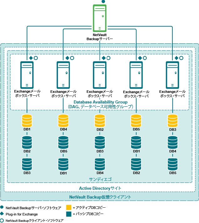 Exchange 2010のシングル・ロケーションDAG内では、シングルActive Directoryサイトに複数のExchange Mailbox Serverが存在し、それらは同一データ・センター内に物理的に位置します。DAGは複数のメールボックス・サーバーにまたがって作成されると同時に、そのデータベース・コピーも複数のメールボックス・サーバーに拡散しています。シングル・ロケーションDAGでは、各Exchange Mailbox Servers上にPlug‑in for ExchangeをインストールしたNetVault Backup仮想クライアントを作成します。