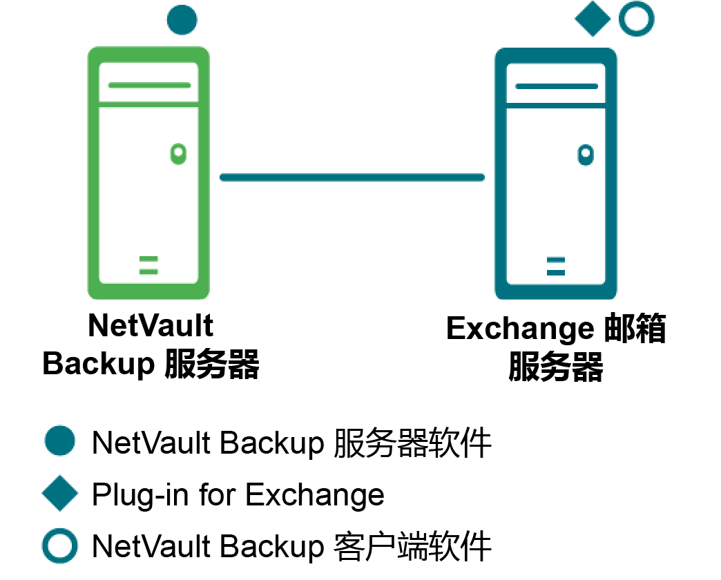 重要信息: 不管环境如何,即单独的 NetVault Backup 服务器和 Exchange 服务器以及配置为两种服务器的单台机器,Plug‑in for Exchange 都必须安装在 Exchange 服务器邮箱数据库所在的主机上。本指南中的所有样本图像和过程均假定您使用的是两台计算机的环境,并且已满足全部配置要求。 |