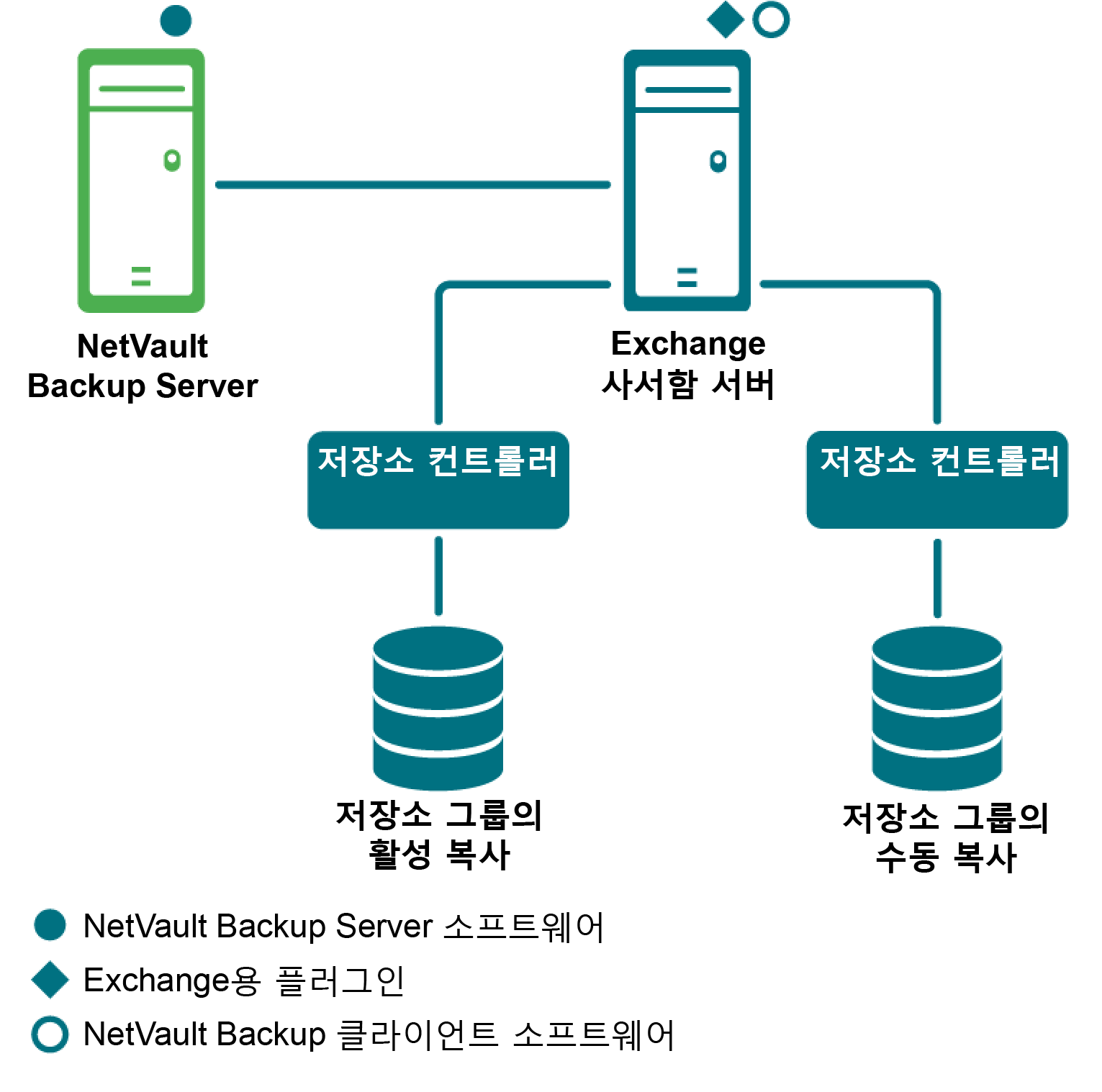 CCR 배포에서 플러그인은 Exchange 가상 서버에 설치됩니다. Exchange 가상 서버는 클러스터를 구성하는 호스트와 노드의 그룹입니다. NetVault Backup 서버는 클러스터를 가상 클라이언트라고 하는 단일 클라이언트로 인식합니다. Exchange용 플러그인을 가상 서버에 설치할 때 플러그인은 NetVault Backup의 클러스터 지원을 사용하여 모든 노드에 설치됩니다. NetVault Backup의 가상 클라이언트는 활성 또는 수동 노드를 백업하는 데 사용되며 이 예에서는 Exchange 가상 서버입니다.