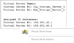 IP Address of the SQL Server Virtual Server: In the Virtual Client Address field of the Virtual Client page, enter the IP Address assigned to the appropriate SQL Server Virtual Server. For example, if you are creating the first of the two SQL Server Virtual Servers in a failover cluster, enter the IP address assigned to the first Virtual Server. |