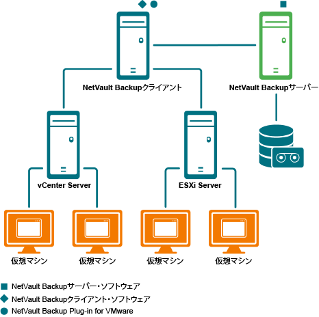 Plug‑in for VMwareは、WindowsまたはLinuxベースのNetVault Backupクライアントいずれにも導入できます。このクライアントはバックアップ・プロキシとして動作します。物理マシンまたは仮想マシンをバックアップ・プロキシとして選択できます。