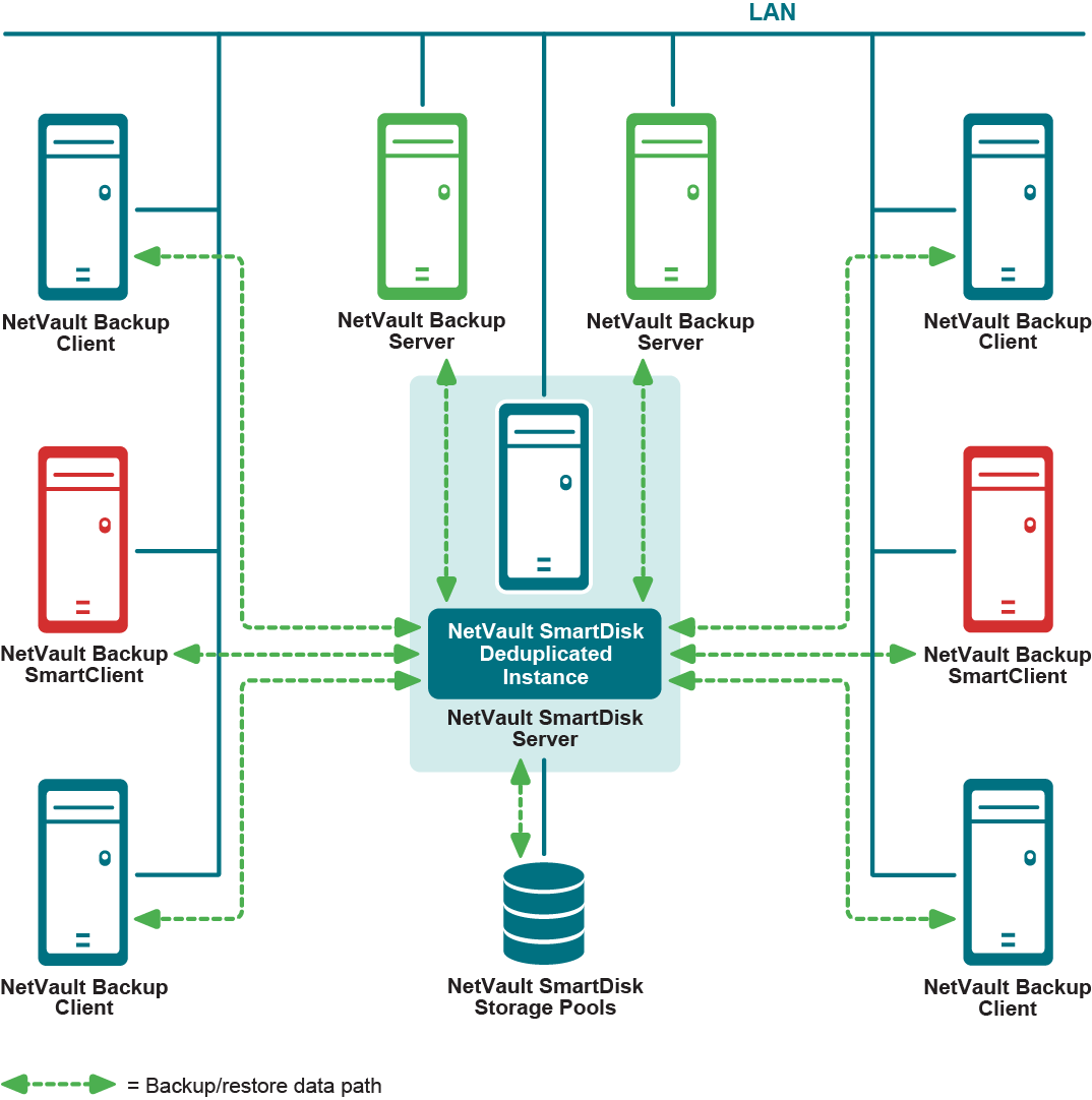 In environments where only one NetVault SmartDisk Instance is required for a domain with one or more backup servers and you want the backups from all backup servers deduplicated together, you must deploy a single NetVault SmartDisk Instance on a dedicated server that has no backup server software installed.
