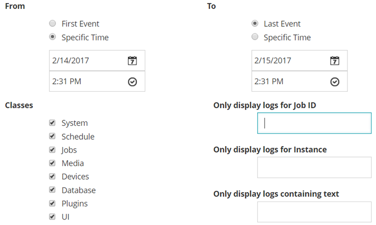 By default, all log classes are selected. To hide log messages for a class, clear the corresponding check box. | |||||||||||||||||