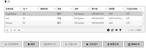 任务摘要:此区域将显示以下信息:任务标题、任务 ID 和任务类型(备份或恢复)、客户端名称、插件名称、任务创建日期、任务修改日期、运行计数、平均持续时间、平均大小、备份或恢复选择集、备份选项集、计划集、源集、目标集和备份或恢复高级选项集。