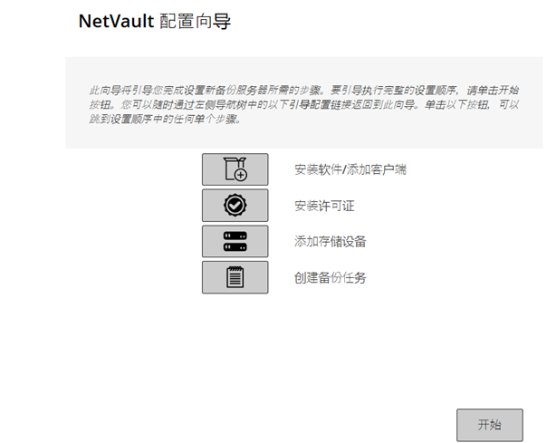 NetVault Backup WebUI 提供的配置向导可指示您完成备份系统各方面设置。您可以使用向导安装客户端和插件软件包、添加客户端、配置设备、安装许可证密钥和创建备份任务。可在“导航”窗格中从引导配置访问配置向导。