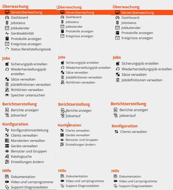 Wenn Sie die Option Kontextmenüs auswählen, werden die seitenbasierten Aktionsschaltflächen unten auf der Seite durch ein Kontextmenü ersetzt, das als Auslassungspunkte-Symbol oben auf der Seite (nach dem Seitentitel) angezeigt wird. Außerdem werden die tabellenbasierten Aktionen in der Spalte „Aktionen“ in der Tabelle angezeigt. Klicken Sie auf das Auslassungspunkte-Symbol und wählen Sie die gewünschte Aktion aus. Diese Option gilt für einige der NetVault Backup-WebUI-Seiten.