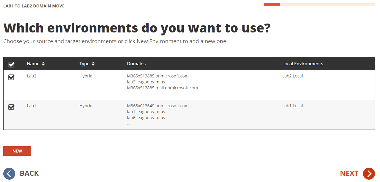 - Click New to create a new environment or choose any existing environments from the list. Click Next once you have at least two environments selected.