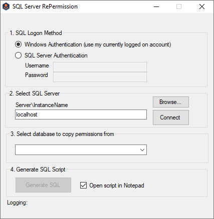 8. Select the SQL Logon Method. If SQL Server Authentication is selected, enter the Username and Password. If Windows Authentication will be used, you must be logged onto the machine with an account that has access to the SQL Server instance and databases to be re-permissioned.