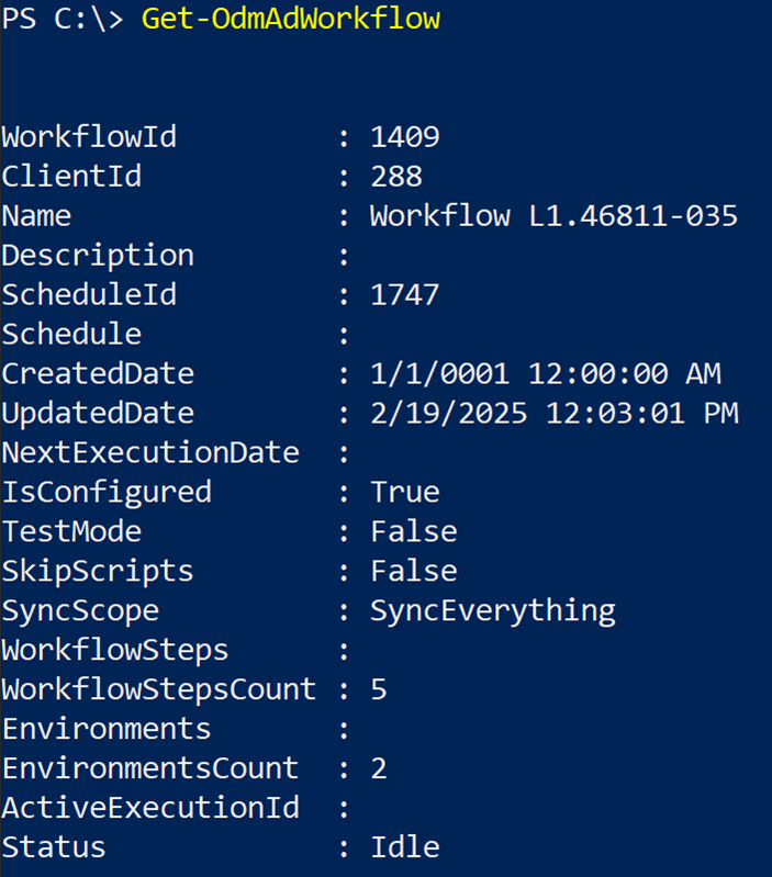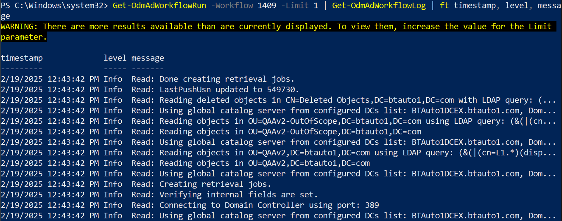 Get-OdmAdWorkflowRun -Workflow  <WorkflowId> -Limit 1 | Get-OdmAdWorkflowLog | ft timestamp, level, message