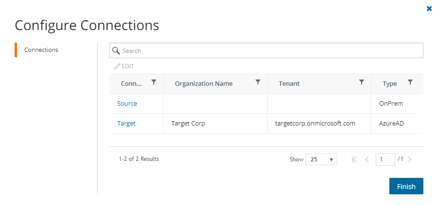 - From the Configure Connection wizard select the source or target tenant that you want to configure. Then click Edit.