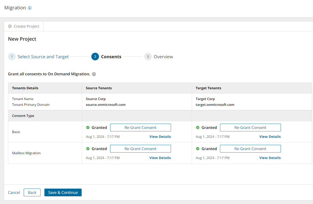 The migration service principals must be granted the necessary consents. See Consents and permissions for more information. If HMA is enabled then the consents for both tenants are displayed. If HMA is not enabled then only the consents for the source or target tenant that has the Exchange Online is displayed.
