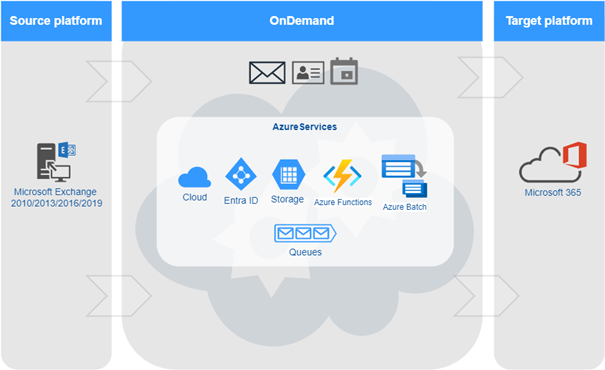On Demand Migration for Hybrid Exchange (ODMHE) securely migrates data to Microsoft 365 from on-premises Microsoft Exchange without requiring organizations to install or maintain migration servers for the move. From a single console, administrators can migrate multiple users simultaneously and migrate data such as email, calendars and folders in a phased approach. Administrators can filter to clean up unwanted data and shorten the time it takes to migrate.