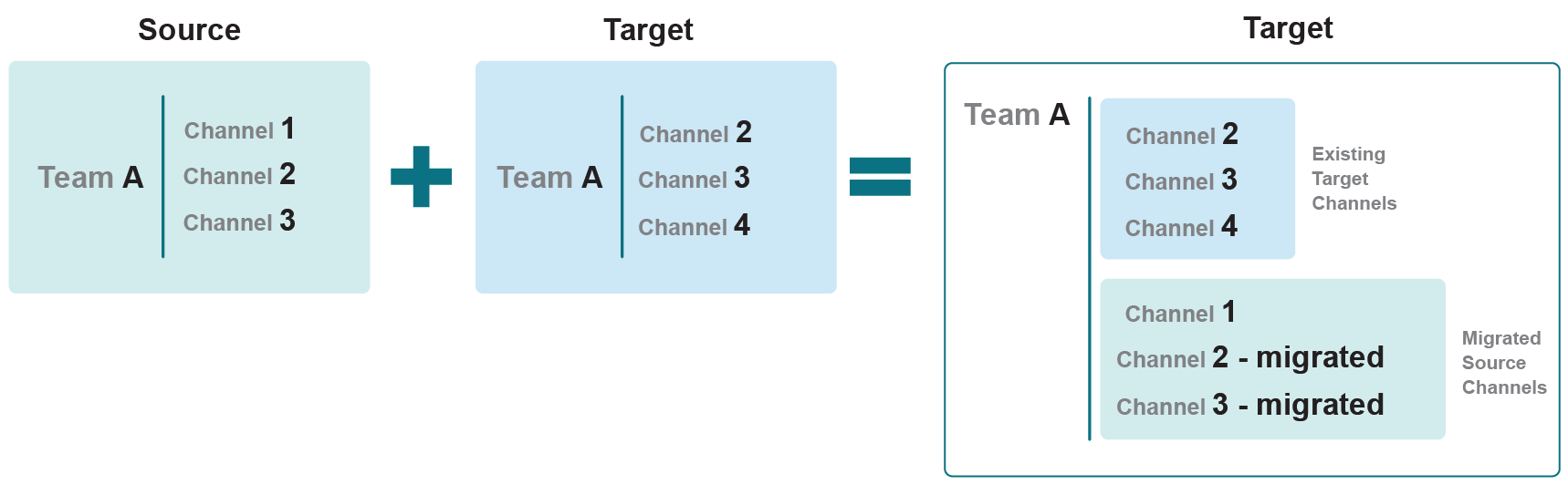 - Merge to the existing team on target - Select this option to merge a team in the source tenant with a team in the target tenant that has the same name. Then select an option if a team channel with the same display name already exists in the target team: