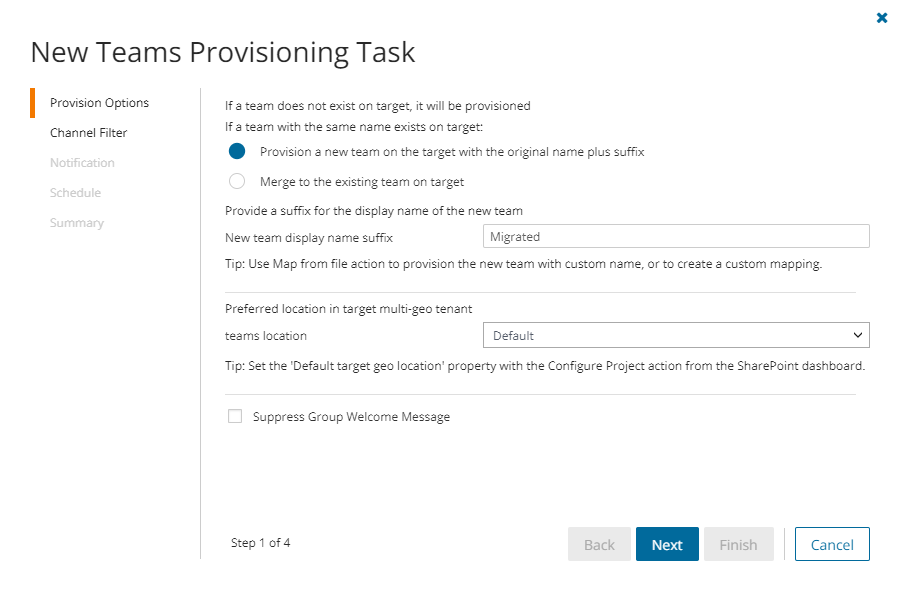 - Suppress Group Welcome Message - Select this option to prevent spamming users with welcome messages when Teams are provisioned on the target tenant.