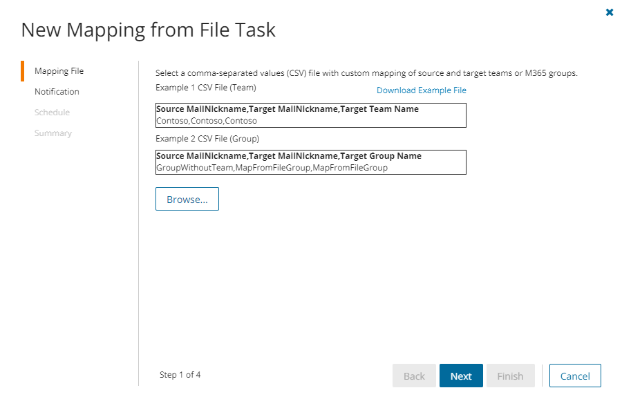 - You can download a CSV template when you start the New Mapping from File Task wizard and click Download Example File from the Mapping File step.
