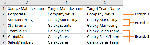 - Target Team Name - display name of the target team. The column header is case sensitive. If two or more records have the same Target Mailnickname then the Target Team Name for each record must be specified and must be the same.