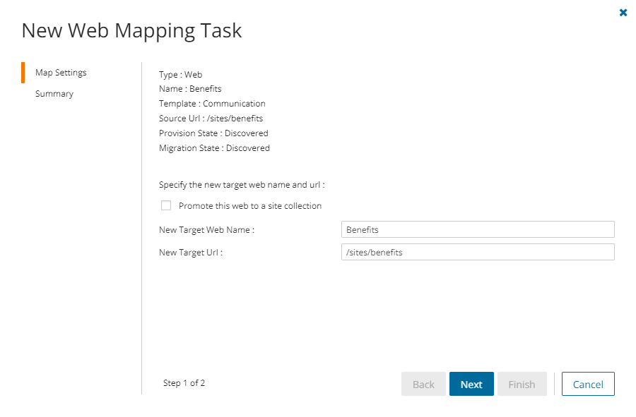 Webs or sub-sites that have not been migrated can be renamed, mapped to a different parent, or promoted to a site in the target tenant. When these objects are migrated, they will be renamed, relocated to the new parent or promoted to a site. The web is retained in the source tenant but set as Relocated (ie., not migratable)
