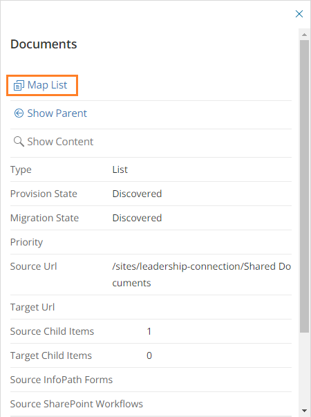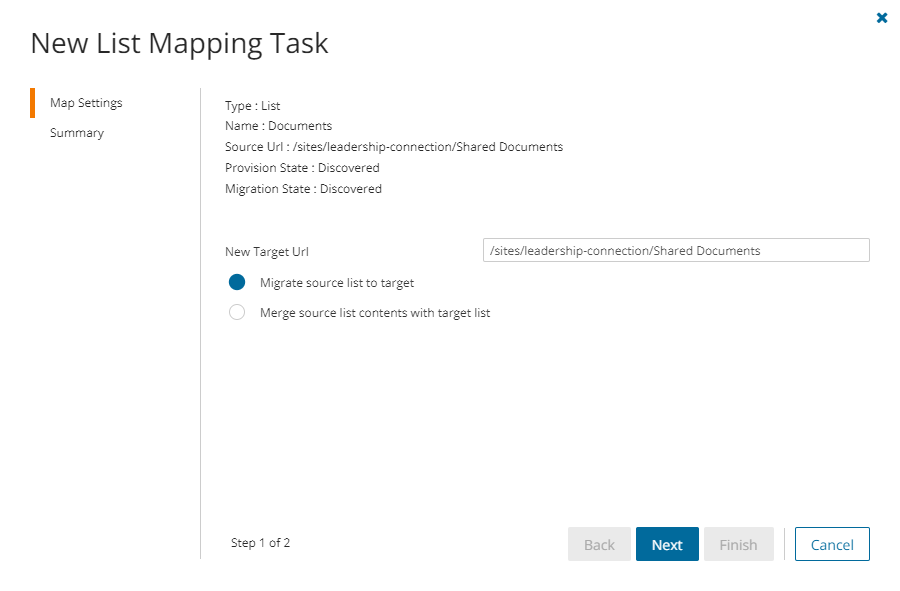Lists or libraries that have not been migrated can be mapped to a different web on the target tenant or mapped to an existing list. When these objects are migrated, they can be relocated to the new SharePoint web or merged with a target list. This web can be in the same site or a different site.