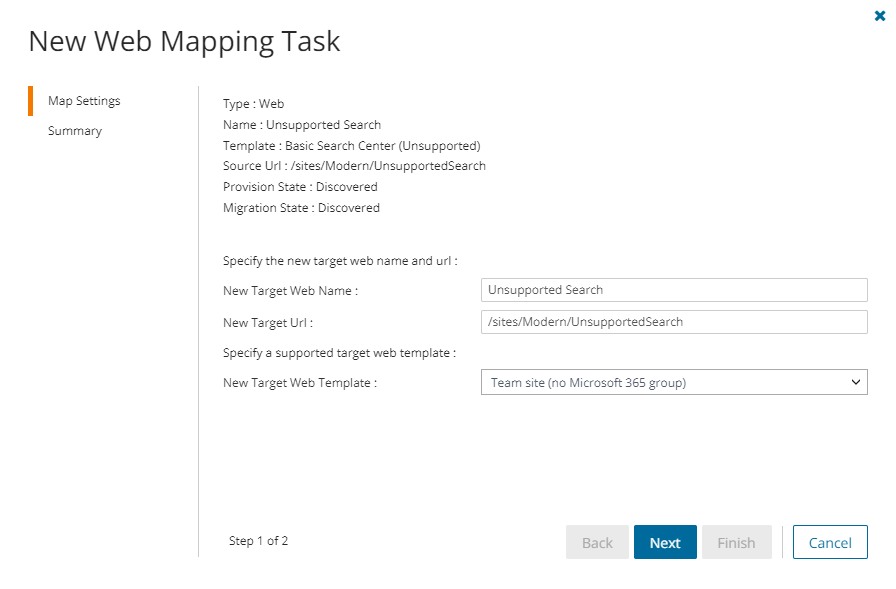 3. Specify a supported target web template. This option is available if the selected site has an unsupported template.