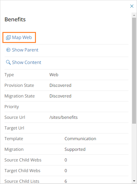 2. Select a web that has not been migrated. You can select only one web at a time. Then click Map Web from the list detail pane.