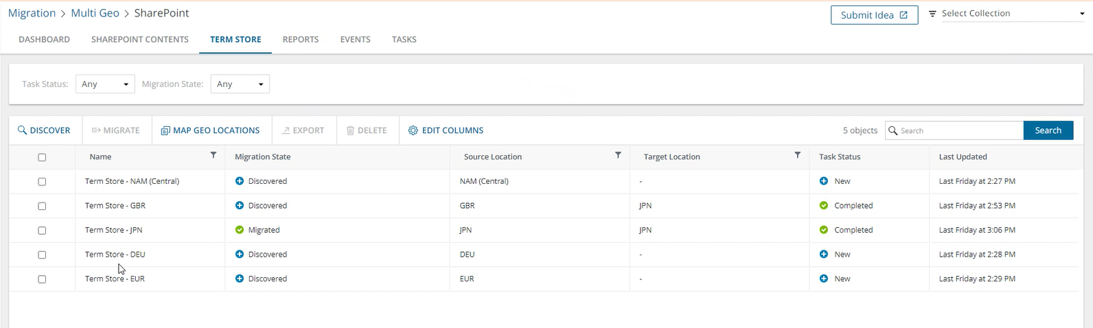 If you want to migrate SharePoint Term Stores to a geo located target tenant, you must map the discovered source tenant Term Stores to active geo locations in the target tenant. For more information see Mapping Geo Locations.