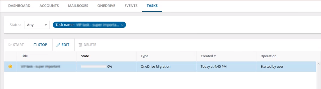 Click the Tasks tab to see the Tasks list. The Tasks list displays all the tasks that are initiated throughout the migration process. From the Tasks list you can: