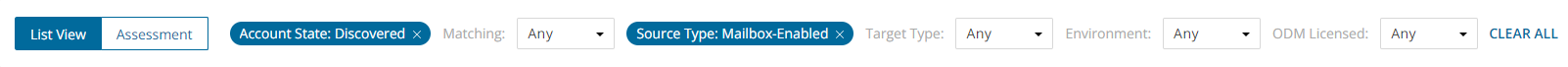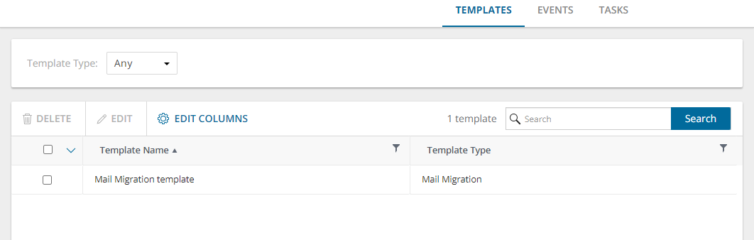 Template Type - You can filter the Templates list view with this filter. To apply a filter, select a value from the filter dropdown that lists the various template types available in the Templates list view. Migration workspaces may have one or more template types that are specific to he workspace. For example, Mail Migration is a template type in the Accounts and User Data migration workspace, and Migrate SharePoint Contents is a template type in the SharePoint migration workspace.