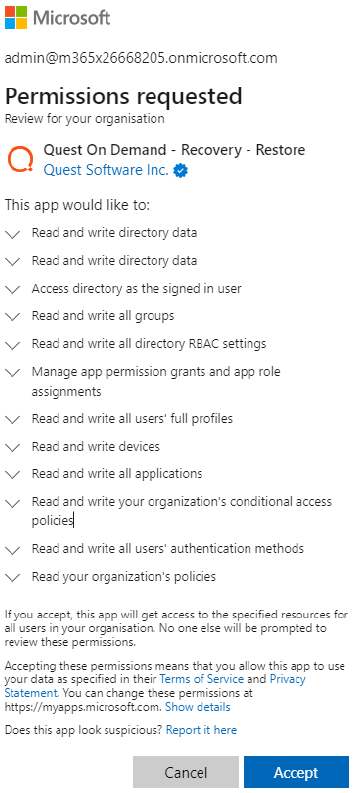 On Demand Recovery requires access to the customer’s Microsoft Entra ID and Microsoft 365 tenants. The customer grants that access using the Microsoft Admin Consent process, which will create a Service Principal in the customer's Microsoft Entra ID with minimum consents required by On Demand Recovery (Groups and Users).