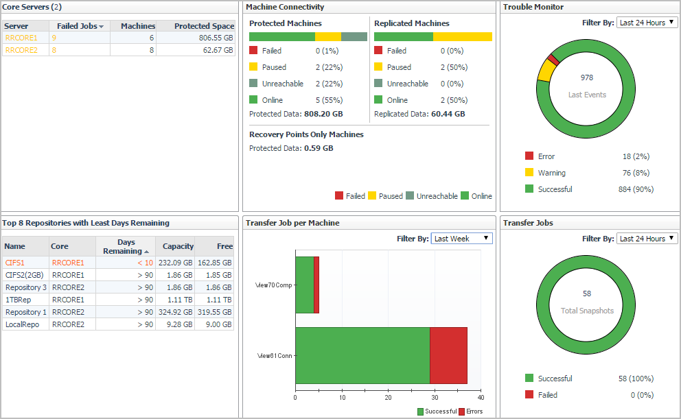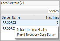 Core Servers: This table lists the monitored Rapid Recovery Core Servers. Click this link to navigate to the Rapid Recovery Infrastructure Tab. For more information, see Rapid Recovery Infrastructure Tab. |