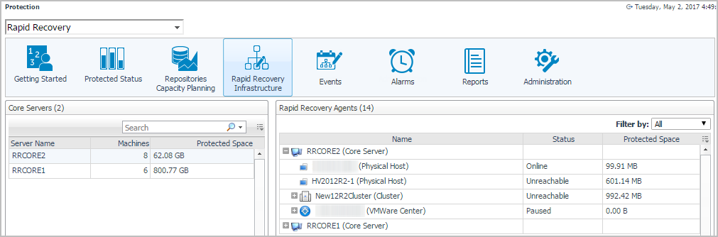 The Rapid Recovery Infrastructure view of the Protection dashboard shows the infrastructure of the service scoped Rapid Recovery Core servers. The Rapid Recovery Infrastructure view includes the following two tables: