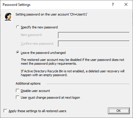 • Leave the password unchanged. Select this option if you want to leave the user password unchanged. When you select this option, the restored user account can be disabled if its password does not meet the password policy requirements.