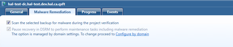 When the Pause recovery in DSRM option is managed by domain settings, it applies to all domain controllers in the project for the selected domain. When enabled for entire domain, you can not individually enable the pause recovery in DSRM option for specific domain controllers. To do so, within Configure by Domain, unselect the domain(s). After a domain is unselected, within the project select each Domain Controller the pause is required for. From the Malware Remediation tab, select to enable Pause recovery in DSRM to perform maintenance tasks including malware remediation. |