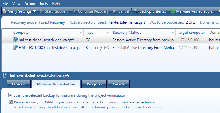 Pause recovery in DSRM to perform maintenance tasks including malware remediation can be enabled for specific domain controllers by selecting the option from the Malware Remediation tab from each domain controller in the project, or for all domain controllers in the entire domain/forest.