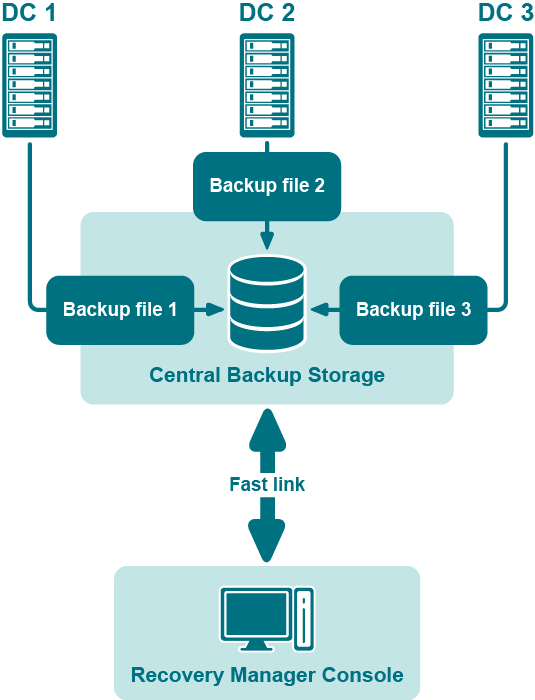 It is recommended that you store such backups in a central backup storage accessible to the Recovery Manager Console via a fast and reliable link. Such a link is required because during a restore operation backup, files may be copied or unpacked from the central backup storage to the computer where you are using the Recovery Manager Console.