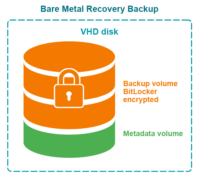 RMAD uses a virtual hard disk encrypted with BitLocker® as a container for the backup (256-bit AES encryption). Only backup volume is encrypted on the VHD disk.