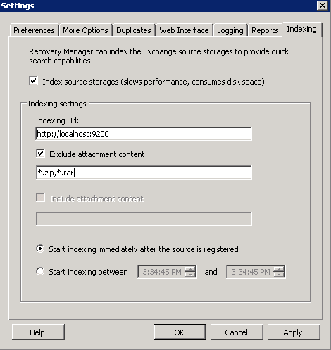 - In the Recovery Manager for Exchange Console, select Tool | Settings from the main menu and go to the Indexing tab.