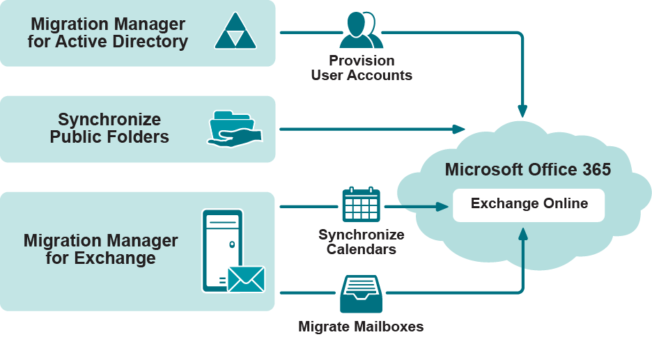 While migrating to Microsoft Office 365 you will need to use both Migration Manager for Active Directory and Migration Manager for Exchange as shown in the figure below: