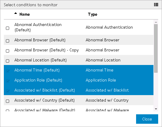 After making changes to the selected conditions, click OK to close the Select conditions to monitor dialog and return to the Edit Shared Policy dialog.