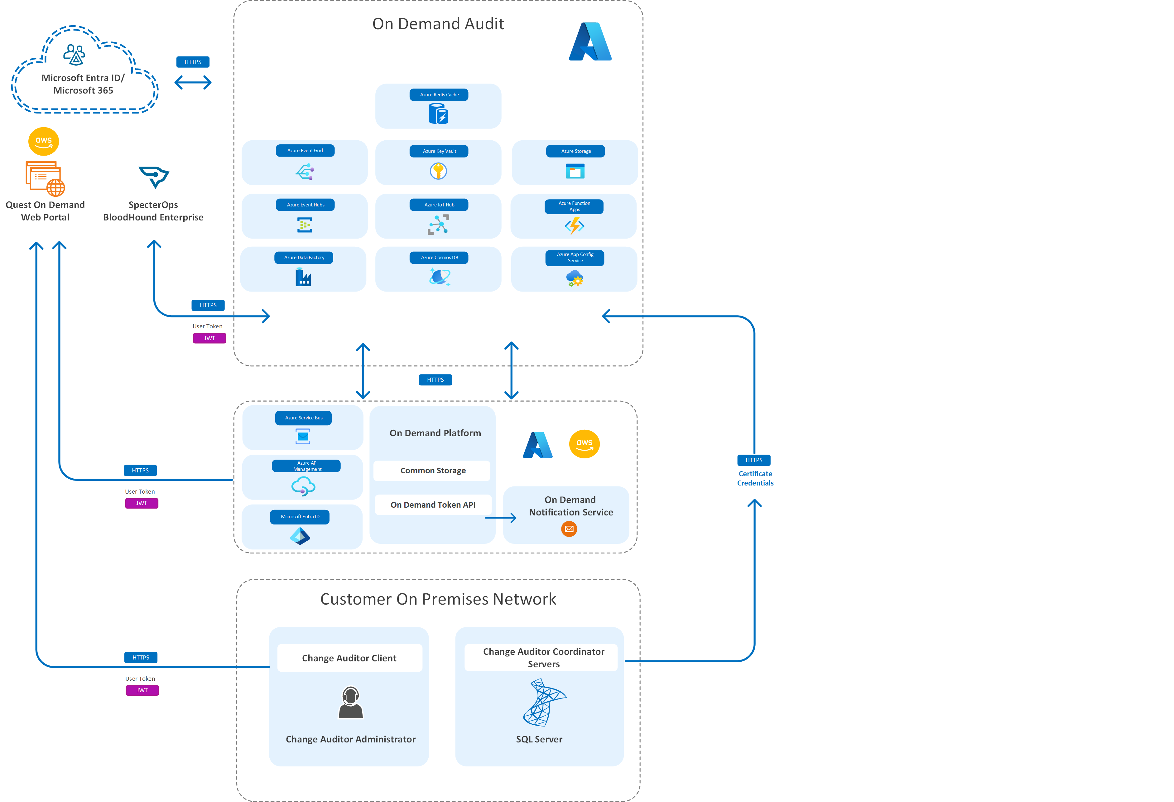 Quest On Demand Audit is an Azure hosted cloud service in the Quest On Demand platform that consolidates audit data from a variety of on premises and Microsoft 365 workloads. Integrating with Quest Change Auditor provides the ability to search and correlate identities across both on premises and in the cloud to give a seamless view of activity in hybrid Microsoft environments.