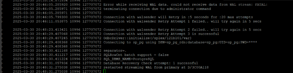 On the SharePlex source, when the SP_CAP_MAX_RETRY_COUNT_PG parameter is set to 20 and the SP_CAP_RETRY_INTERVAL_PG parameter is set to 5, users can observe the following log entries in the Capture and Event logs indicating the auto-restart of Capture.