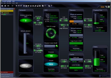The Spotlight Home Page is the main page for the monitored system. It highlights obvious bottlenecks and problem areas. Statistics and flows are updated in real time.