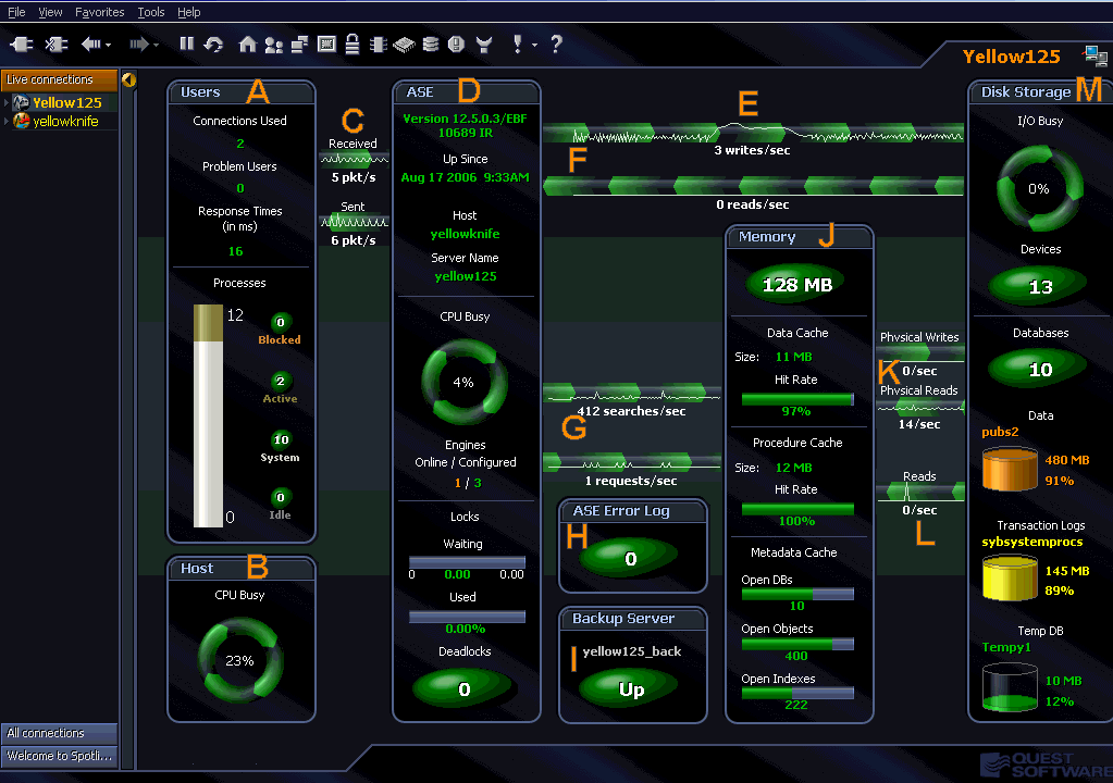 The main Spotlight® on SAP ASE window provides a quick and intuitive view of the activity of a ASE instance.