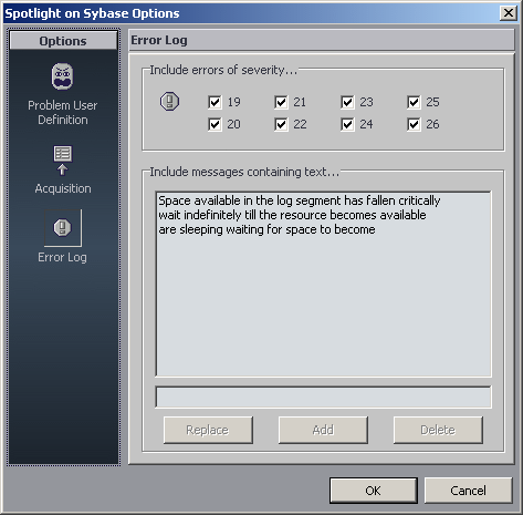 To set these levels, select View | Options | Spotlight® on SAP ASE | Error Log.