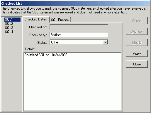 You can automatically add a scanned SQL statement to the Checked List when you use the Send to SQL Optimizer or Send to Index Expert function.