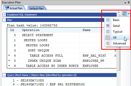 To select a display level for DBMS_XPlan (Formatted), click the arrow beside the Switch DBMS_XPlan level button and select an option.